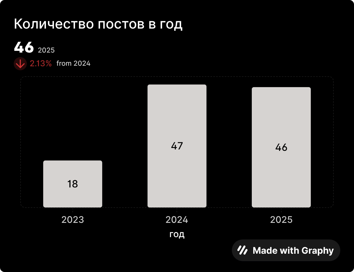 Посмотрим на циферки. За 2025 год я написал 46 постов, из которых:
