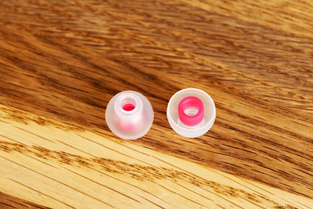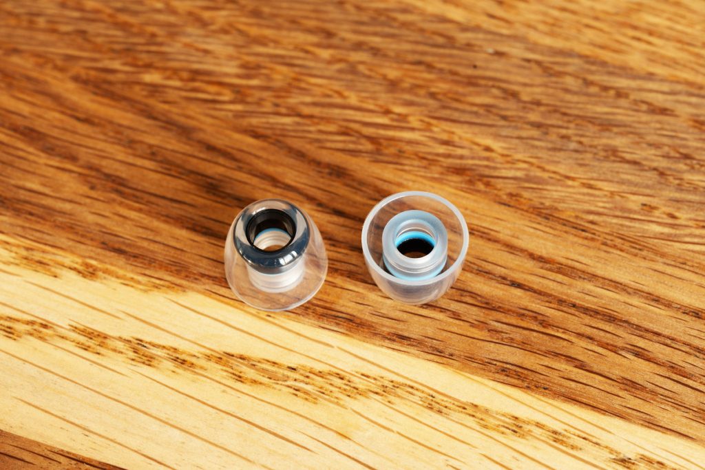 Эта практику подхватили все, такие модели есть у Tangzu (Tang Sancai Noble), Softears (UT Tips), BGVP, Shanling. COREIR имеют выраженную канавку внутри звуковода, которая отлично цепляется за корпус наушника при наличии на последнем ответной части. Хотя даже и на простом трении COREIR держатся на наушниках хорошо. Зачем нужен фокус с кольцом – для решения двух задач: улучшения звукоизоляции за счет использования более длинного амбушюра, а также для стабилизации посадки неглубоко сидящих наушников (см. изделия Tanchjim). Плюс, металлическое кольцо не дает звуководу сплющиваться внутри слухового канала.