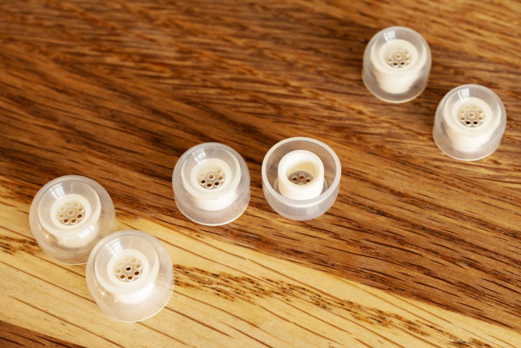 Фактически, SE100 – это просто амбушюры из ТПЭ с интегрированным металлическим удлинительным кольцом. И пропеллером. И я не буду обсуждать, как пропеллер влияет на звук (никак не влияет) – этим озабочены маркетологи производителя. Внезапно, форма фланцев подобрана настолько удачно, что эти странные амбушюры отлично подошли мне в комбинациях с самыми разными наушниками, рассчитанными на средне-глубокую посадку, типа KBEAR Cepheus, Truthear PURE и т.д. C Moondrop Meteor или Aoshida E20 для меня они уже не работают, мешает удлинительное кольцо.