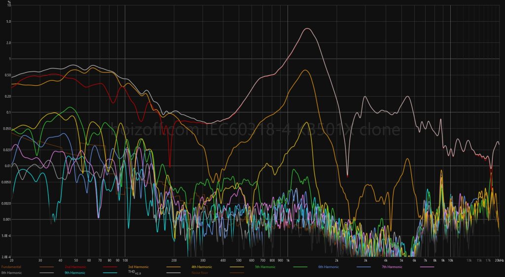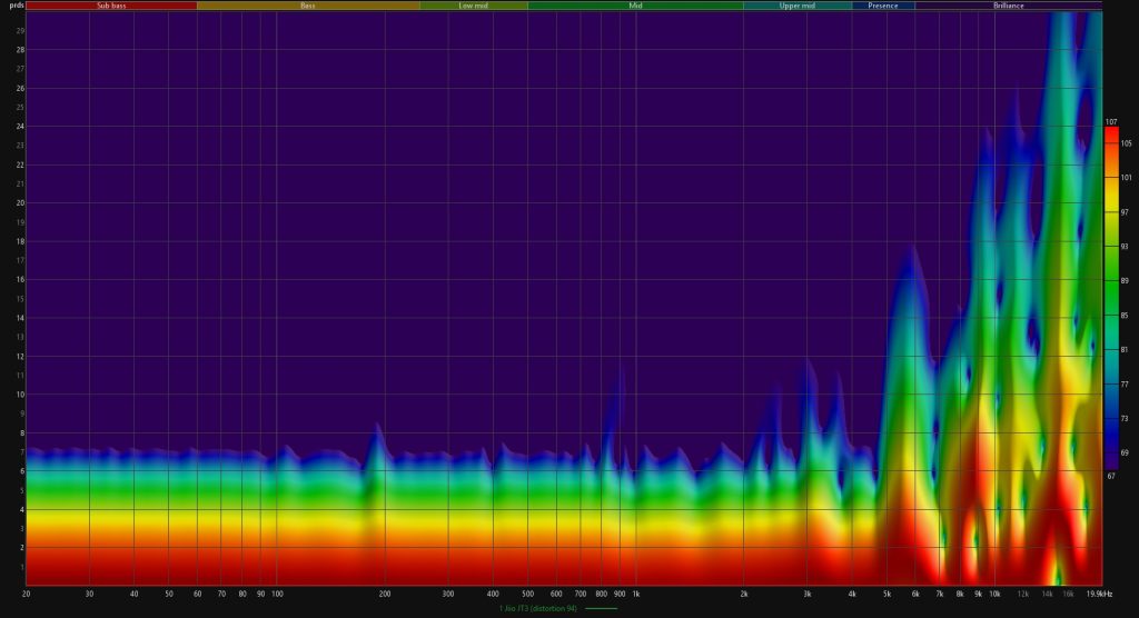 Что касается звука, то ситуация двоякая: звук JT3 более-менее похож на звук FT3 (350 Ω) с замшевыми амбушюрами. Только провала у FT3 на 1500 Гц нет, а у JT3 есть. Если вам нравится такая подача, то это несомненный успех, и надо брать, потому что стоят JT3 втрое дешевле FT3 (350 Ω). Лично мне такой звук не нравится; чуда, которое сотворили Fiio в модели JT1, в этот раз не произошло. JT3 звучат неплохо, они имеют тёплую, басовитую подачу с аккуратным (чего не скажешь по графикам) акцентом около 5,3 кГц. Наушники частенько бубнят, и недостаток громкости около 1500 Гц тоже ясно слышим. Ну и искажения: уже на 94 дБ в самой важной области 1-3 кГц, получаем около 4%, а это много.