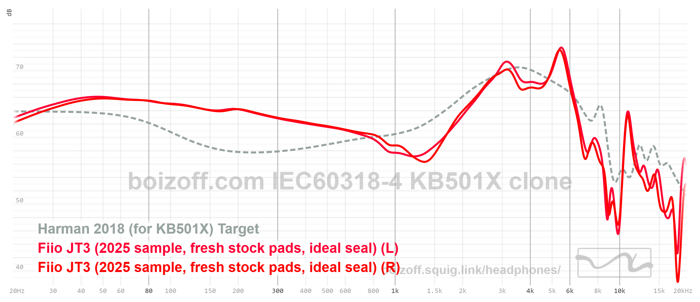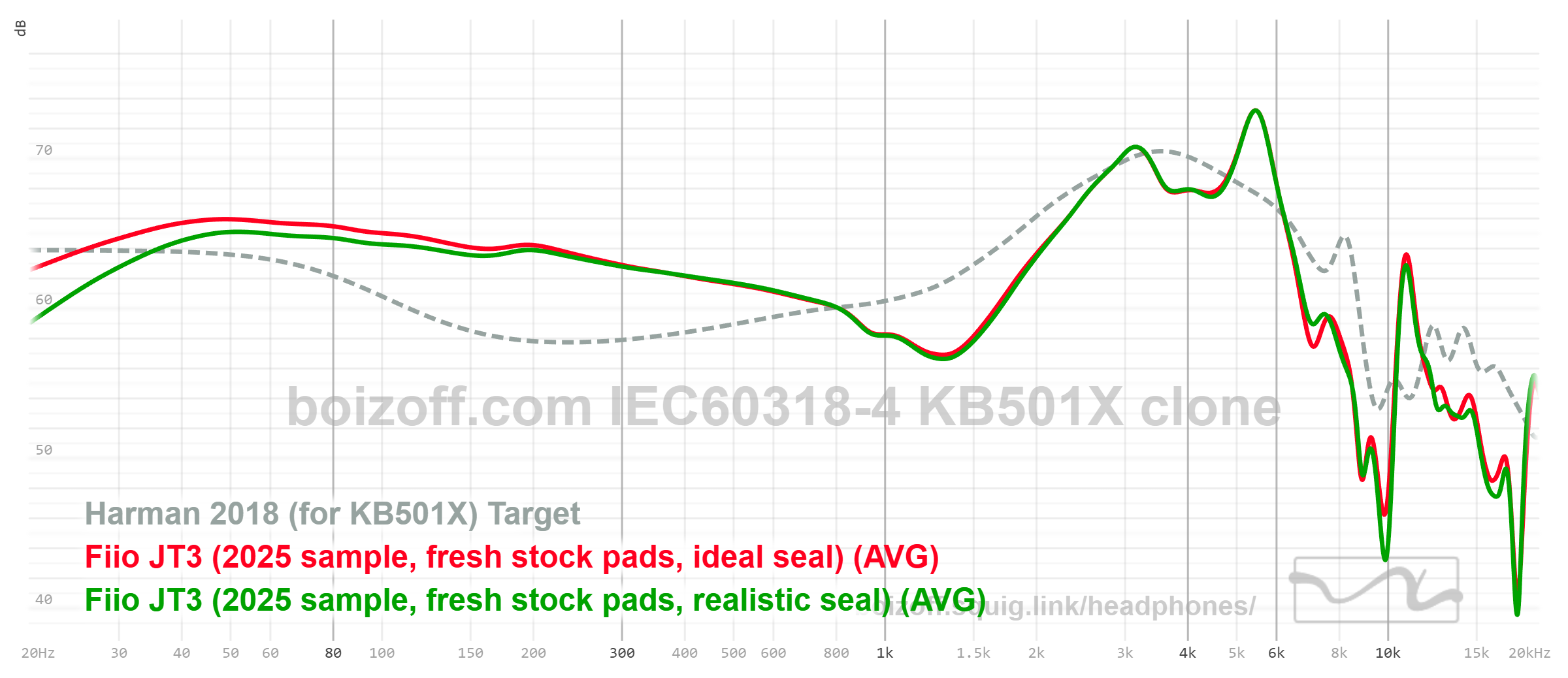 Что касается звука, то ситуация двоякая: звук JT3 более-менее похож на звук FT3 (350 Ω) с замшевыми амбушюрами. Только провала у FT3 на 1500 Гц нет, а у JT3 есть. Если вам нравится такая подача, то это несомненный успех, и надо брать, потому что стоят JT3 втрое дешевле FT3 (350 Ω). Лично мне такой звук не нравится; чуда, которое сотворили Fiio в модели JT1, в этот раз не произошло. JT3 звучат неплохо, они имеют тёплую, басовитую подачу с аккуратным (чего не скажешь по графикам) акцентом около 5,3 кГц. Наушники частенько бубнят, и недостаток громкости около 1500 Гц тоже ясно слышим. Ну и искажения: уже на 94 дБ в самой важной области 1-3 кГц, получаем около 4%, а это много.