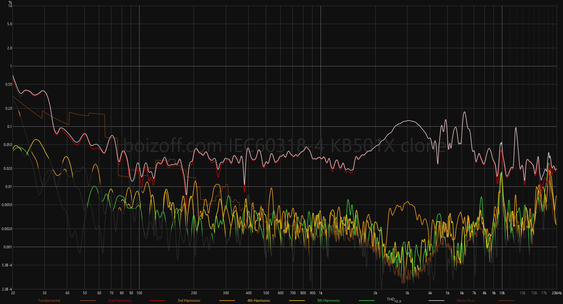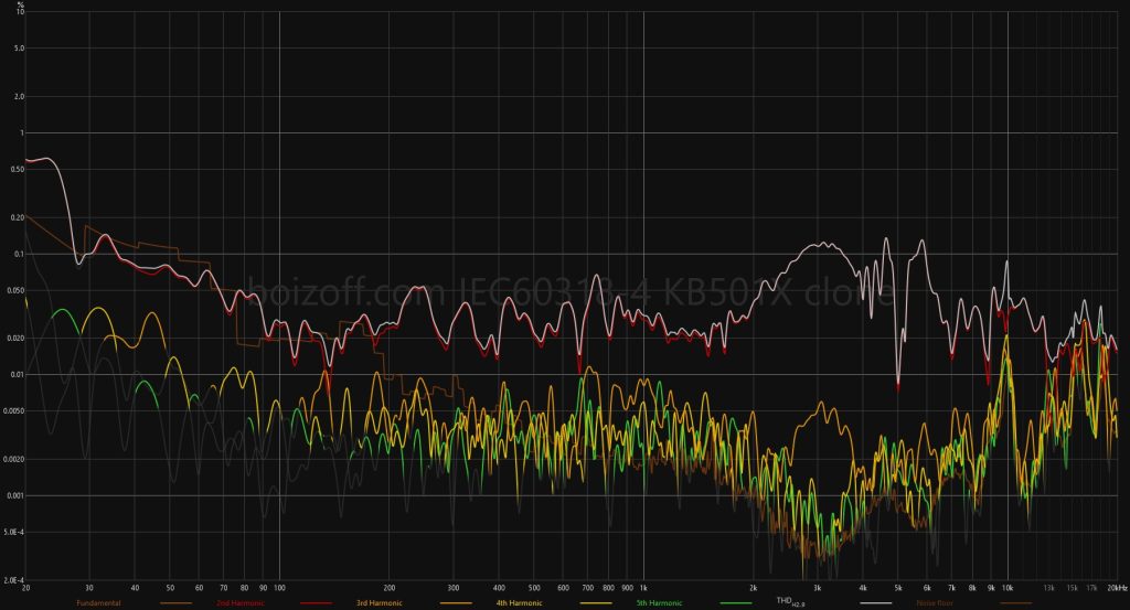 Мне попался экземпляр с дефектной мембраной одного драйвера. Как это бывает у Fiio, на сверхнизких частотах (20-40 Гц) и достаточной громкости (90-94 дБ) драйвер щелкает. Измерения искажений для левого и правого драйвера на 94 дБ громкости приведены ниже. Я бы не заметил этого, если бы не сделал замеров — в моей коллекции не так много музыки, которая активно эксплуатирует сверхнизкие частоты, я не любитель хип-хопа и даб-степа. Но дефект остается дефектом.