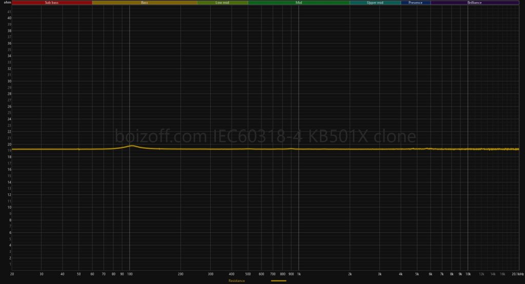 Видим, что первый (черный) и второй (золотой) сэмплы неплохо совпадают по АЧХ. А еще видим, что во втором сэмпле проблема с искажениями на саббасе полностью исправлена. Причем уровень искажений (на 94 дБ) стал ниже по всему слышимому диапазону. И это очень в духе Fiio, которые проделали такую же «работу над ошибками» при выпуске синей ревизии FT1 Pro (но они не стали от этого хорошими наушниками, впрочем). Ну и сопротивление на уровне 19 Ом тоже видим.