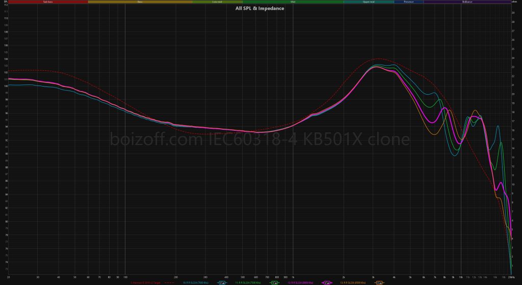 И, прежде чем анализировать АЧХ, напомню, что эта самая АЧХ будет сильно зависеть от глубины посадки. АЧХ SL224 для второго резонанса, приходящегося на 7000, 7500, 8000 и 8500 Гц: