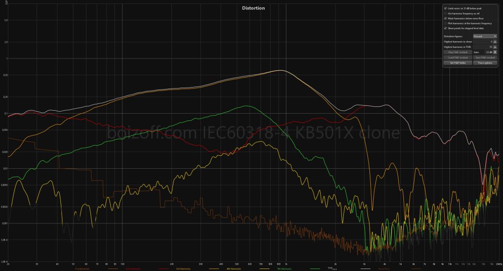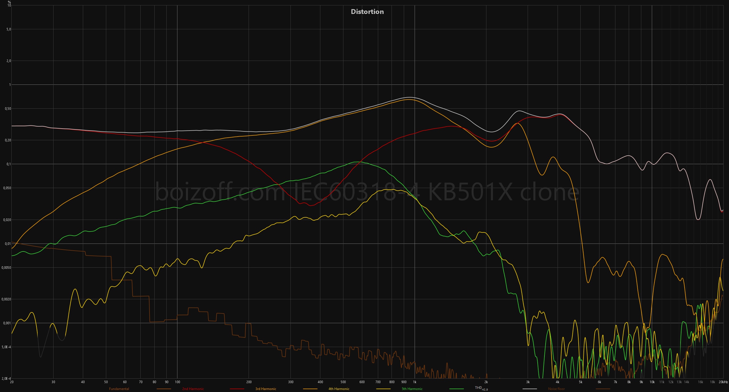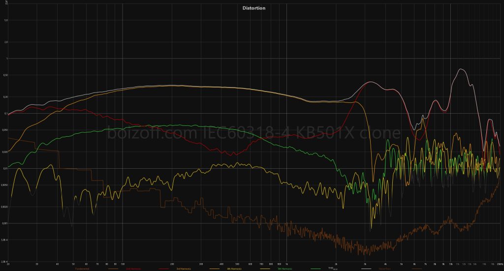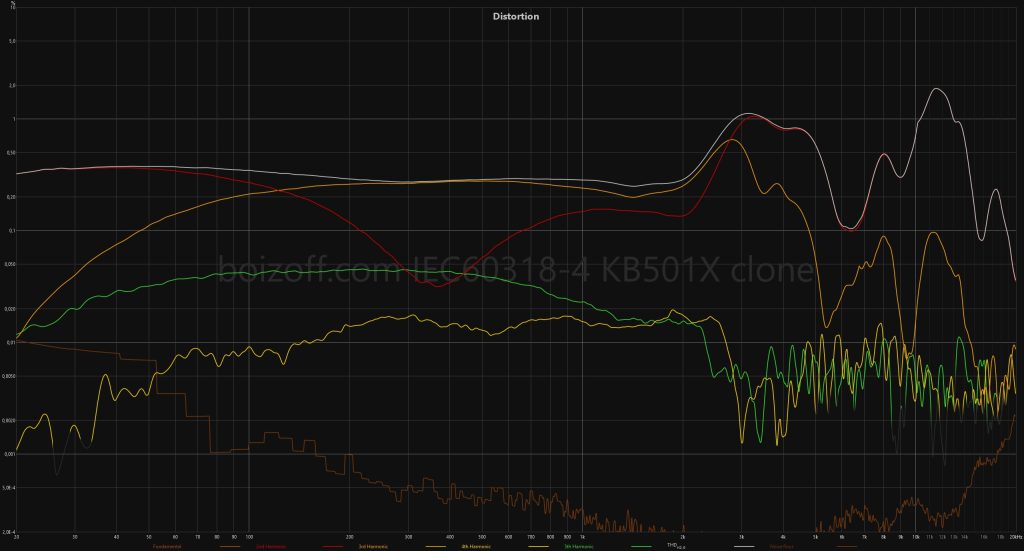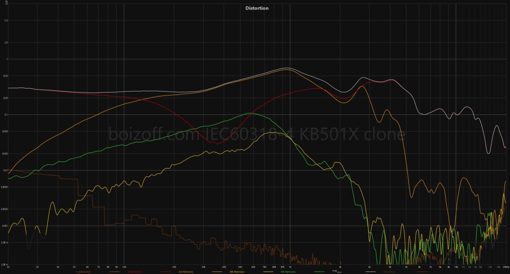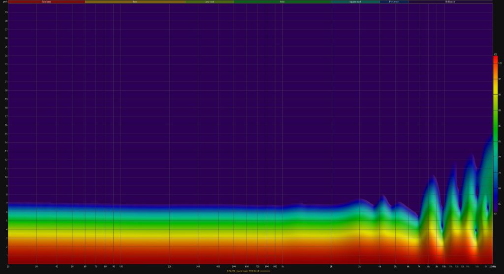 Тут комментировать особо нечего: на 94 дБ искажения только-только перешагивают за 0,5% в максимуме, на громкости 104 дБ – за 1%. То есть никакого слышимого влияния на звук они не оказывают.