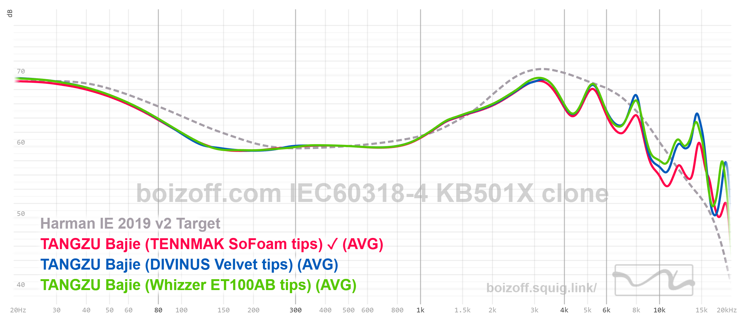 Кажется, что звуковод достаточно узкий для глубокой посадки. На самом деле, он начинает расширяться сразу за фаской. И то ли из-за этой особенности, то ли в силу специфического угла наклона звуковода Bajie заставили меня перебрать практически все имеющиеся у меня амбушюры, это около 50 моделей. Единственные амбушюры, что подошли безоговорочно – это Divinus Prism Wide Bore. Хотя на звуковод шириной 5,9 мм налезет, понятно, что угодно. Комфортными также ощущались OpenAudio 003, но громкость саббаса с ними явно была ниже, то есть нормального прилегания к стенкам слухового канала они не обеспечивали.