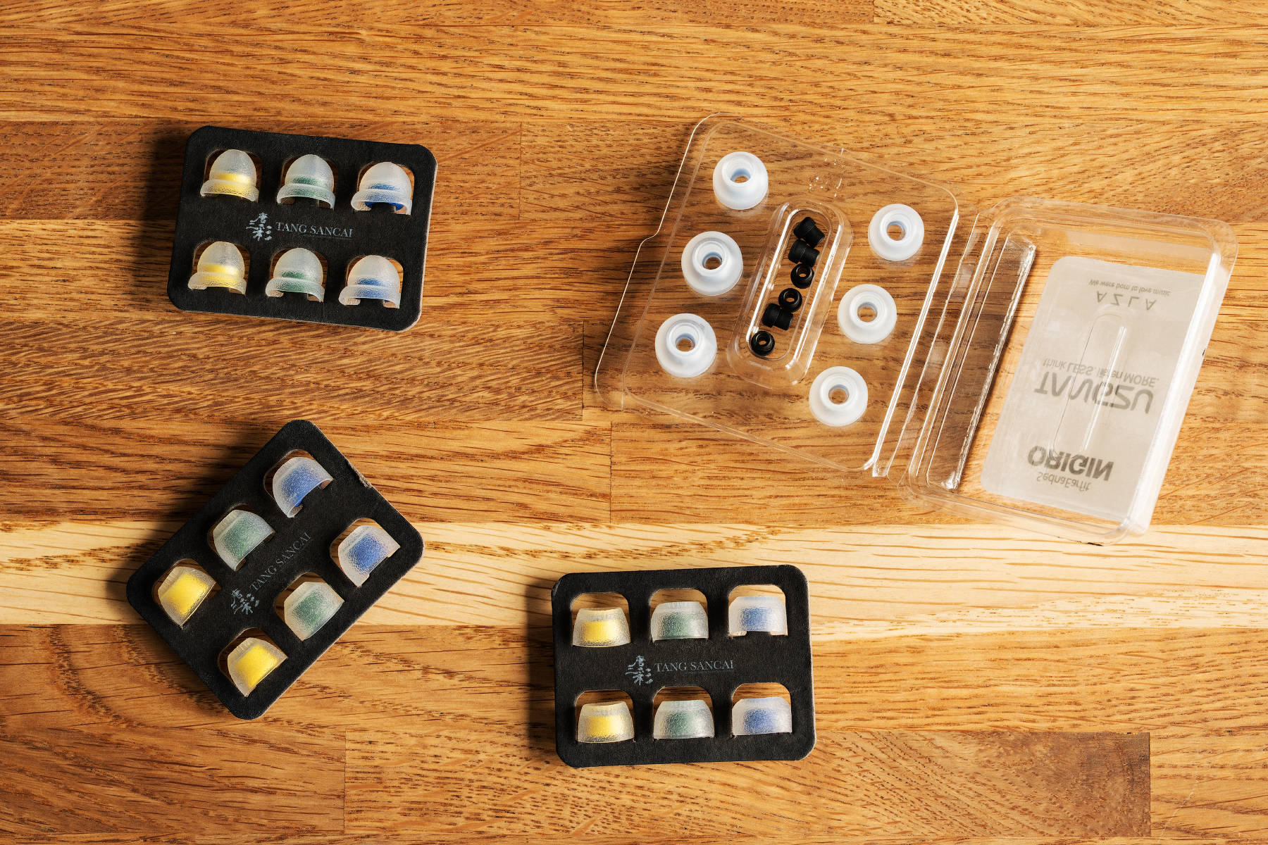 Амбушюры – 3 комплекта от TANGZU и один комплект от Azla. Последние сделаны не из термопластического эластомера, а просто из мягкого бархатистого силикона. Комплекты от производителя – это Tang Sancai, Tang Sancai WB и Tang Sancai Narrow Bore. Если первые две модели общеизвестны, то третья не так популярна. Амбушюры имеют странноватую форму, будто бы создавали 2-фланцевые амбушюры, но потому решили объединить поверхность переднего узкого и заднего широкого фланца в одну. С трудом представляю себе уши, для которых эта модель окажется удобной.