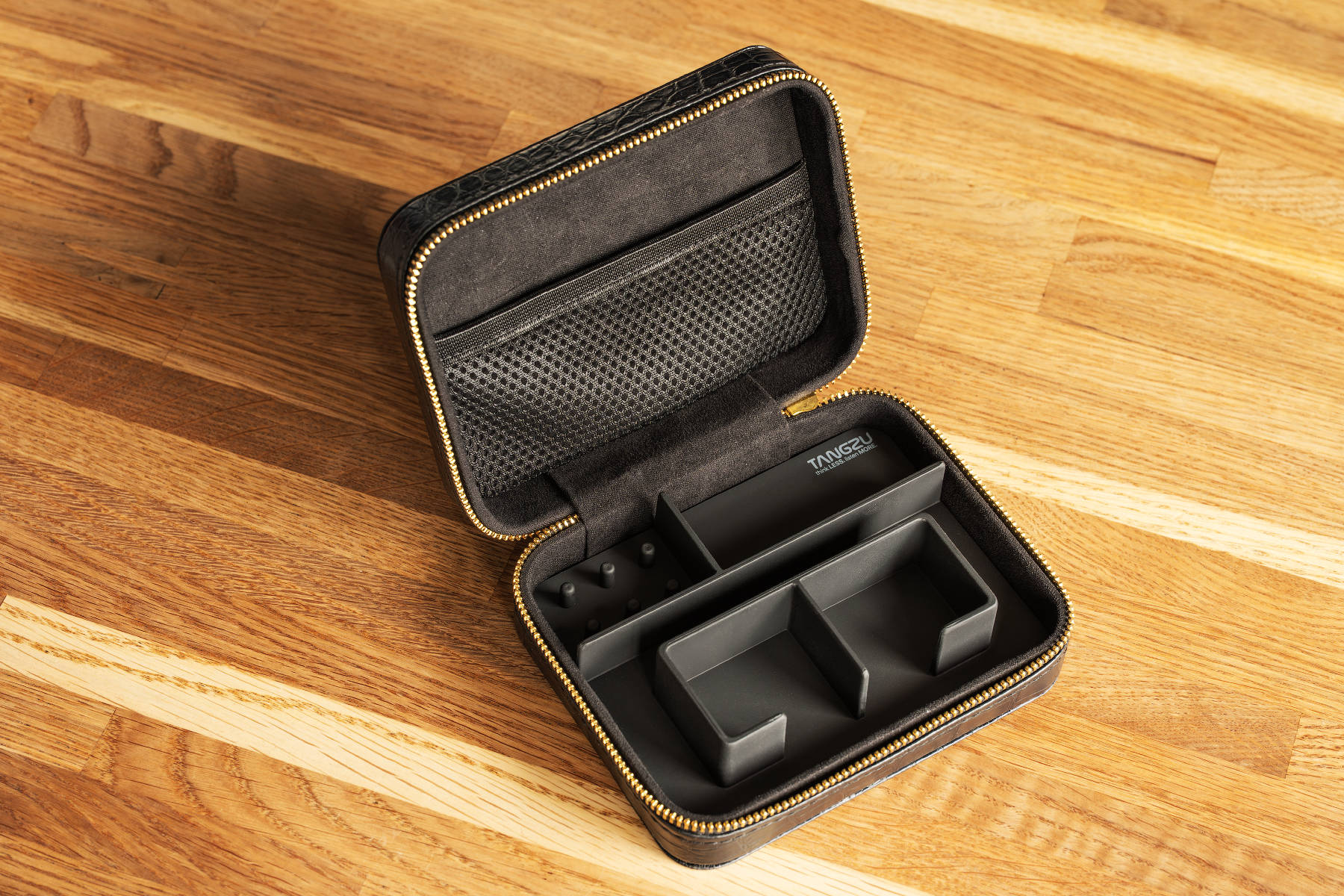 Кейс на молнии, под стать коробке, крупный; он имеет пластиковую внутреннюю вкладку-органайзер, покрытую «soft-touch»-пластиком. Органайзер подразумевает размещение внутри кейса наушников, кабеля, 3 пар амбушюров, а также небольшого портативного ЦАПа. И еще остается карман под верхней крышкой.