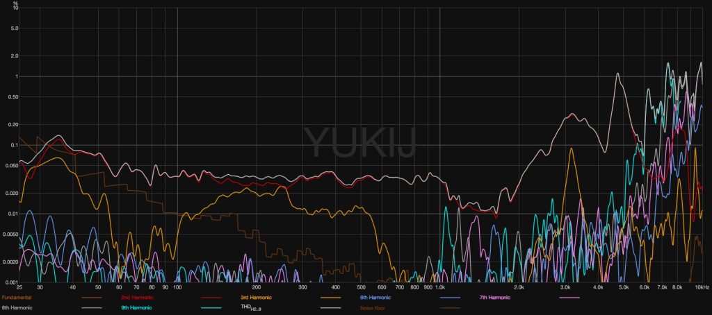 На всём диапазоне до 3 кГц искажения находятся за пределами восприятия (около 0,15%), что даёт свободу при регулировке количества баса без заметного влияния на звук. В диапазоне 3-4,5 кГц наблюдается рост второй гармоники до 1%. Несмотря на то, что это уже слышимая область, влияние на слуховой опыт остаётся минимальным.