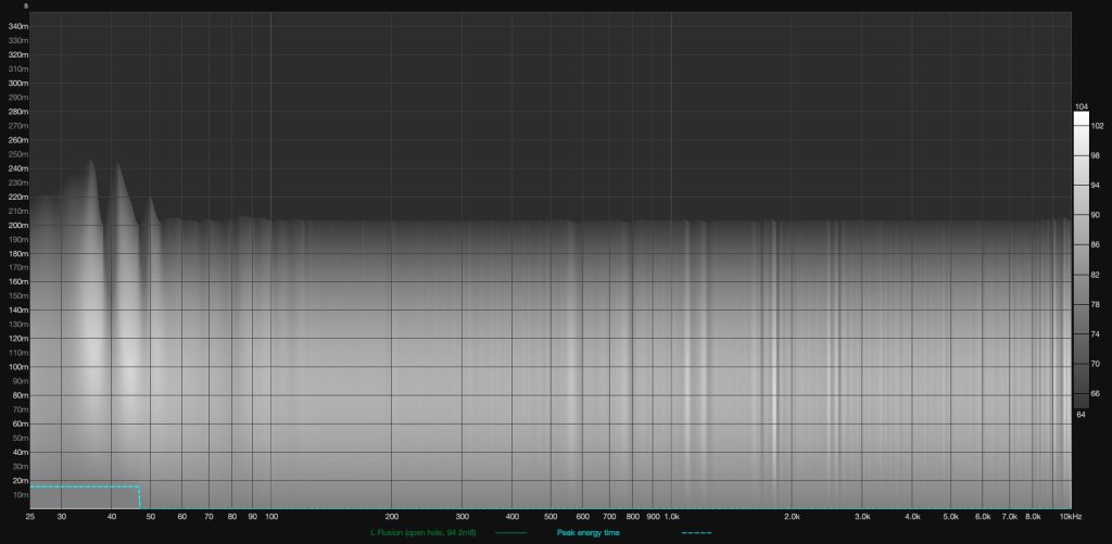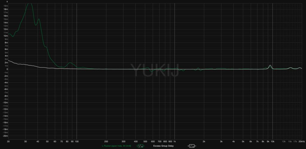 Мы видим довольно обычную для открытых планарных наушников АЧХ – практически линейный график от 60 до 1000 Гц, более-менее соответствующая диффузному полю кривая на участке 3-10 кГц и существенный акцент около 13 кГц. Что отличает Fluxion от многих прочих, так это отсутствие провала на 1,5 кГц и отсутствие акцента на участке 5-7 кГц. Ну и подчеркнутые 40 Гц, конечно, что обусловлено отверстиями в абмушюрах.