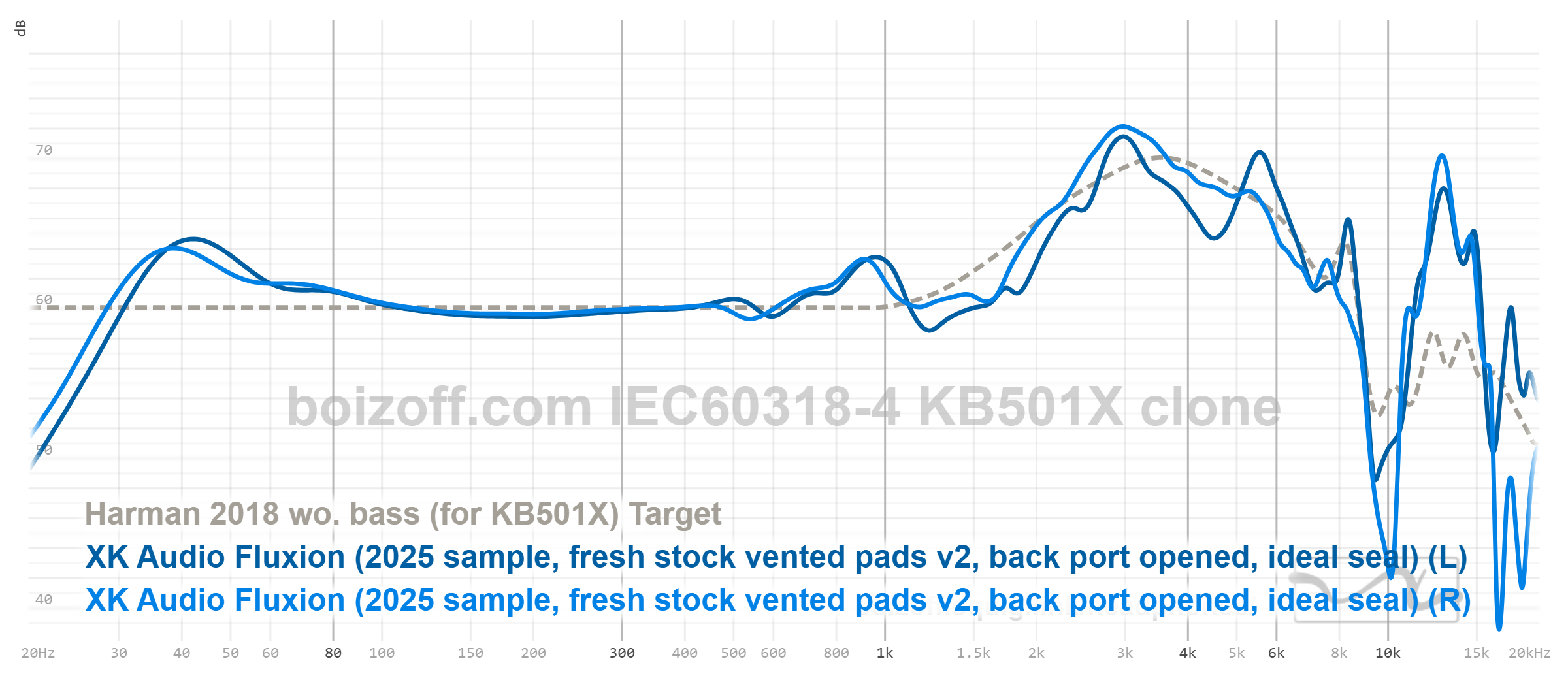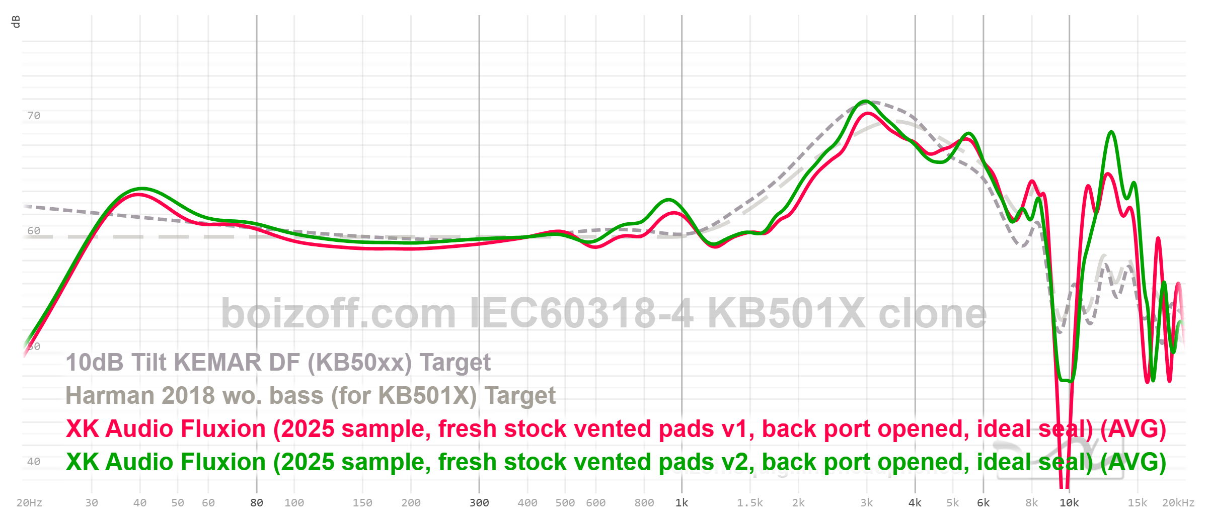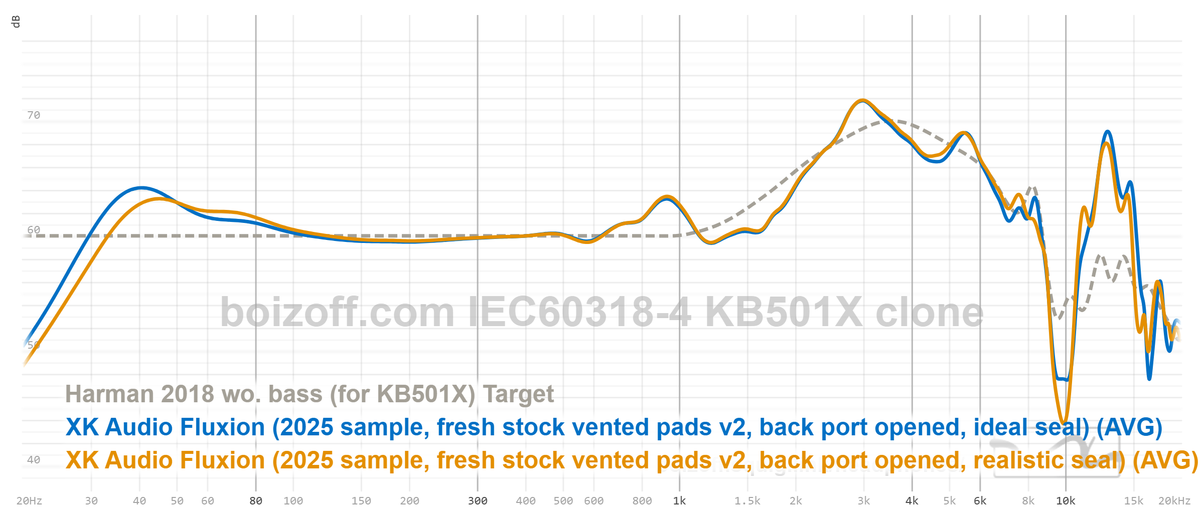 АЧХ XK Audio Fluxion (дырки на амбушюрах закрыты) и HiFiMan HE100 stealth: