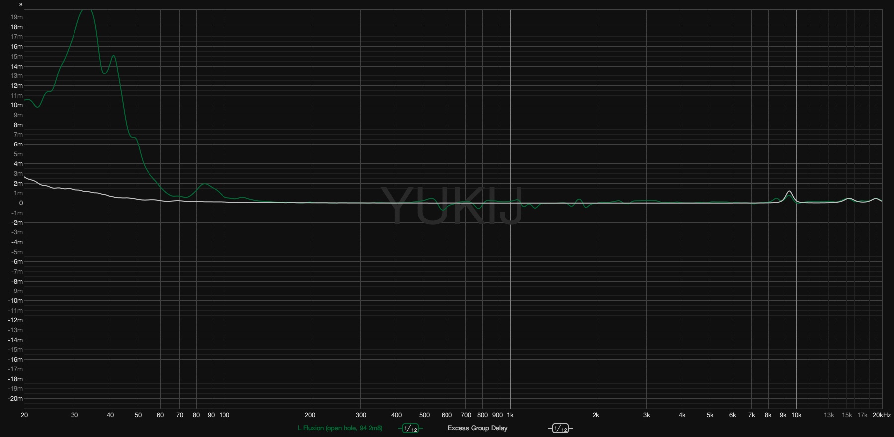 Мы видим довольно обычную для открытых планарных наушников АЧХ – практически линейный график от 60 до 1000 Гц, более-менее соответствующая диффузному полю кривая на участке 3-10 кГц и существенный акцент около 13 кГц. Что отличает Fluxion от многих прочих, так это отсутствие провала на 1,5 кГц и отсутствие акцента на участке 5-7 кГц. Ну и подчеркнутые 40 Гц, конечно, что обусловлено отверстиями в абмушюрах.